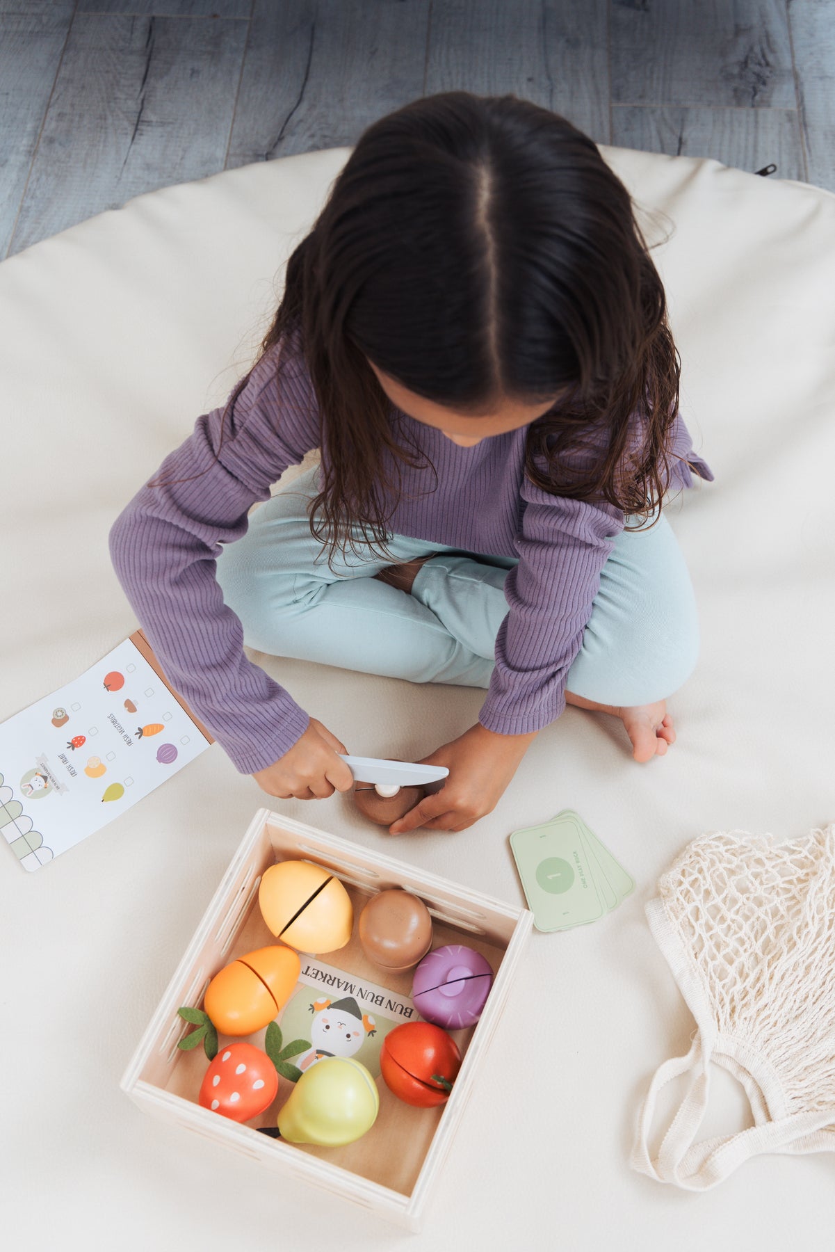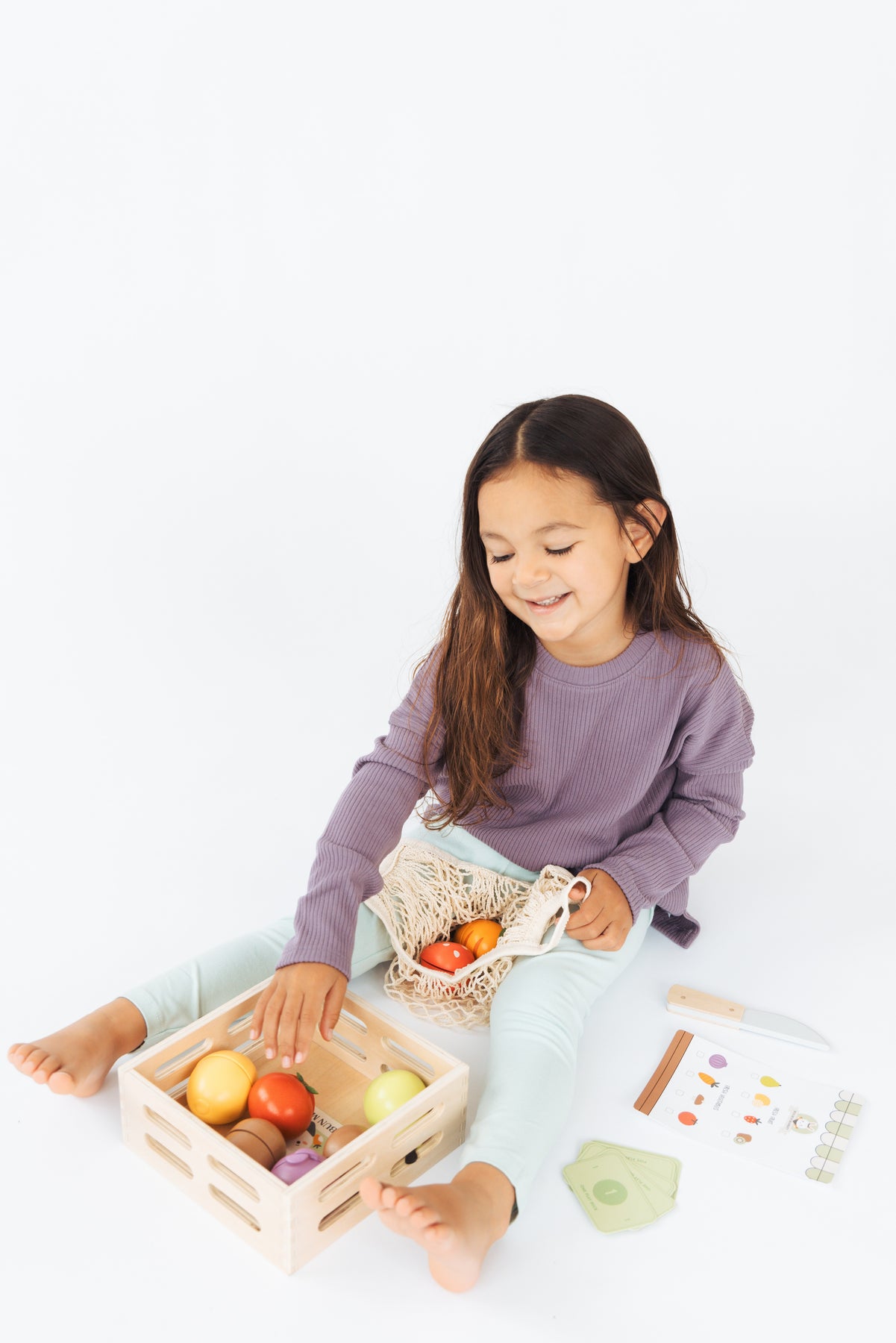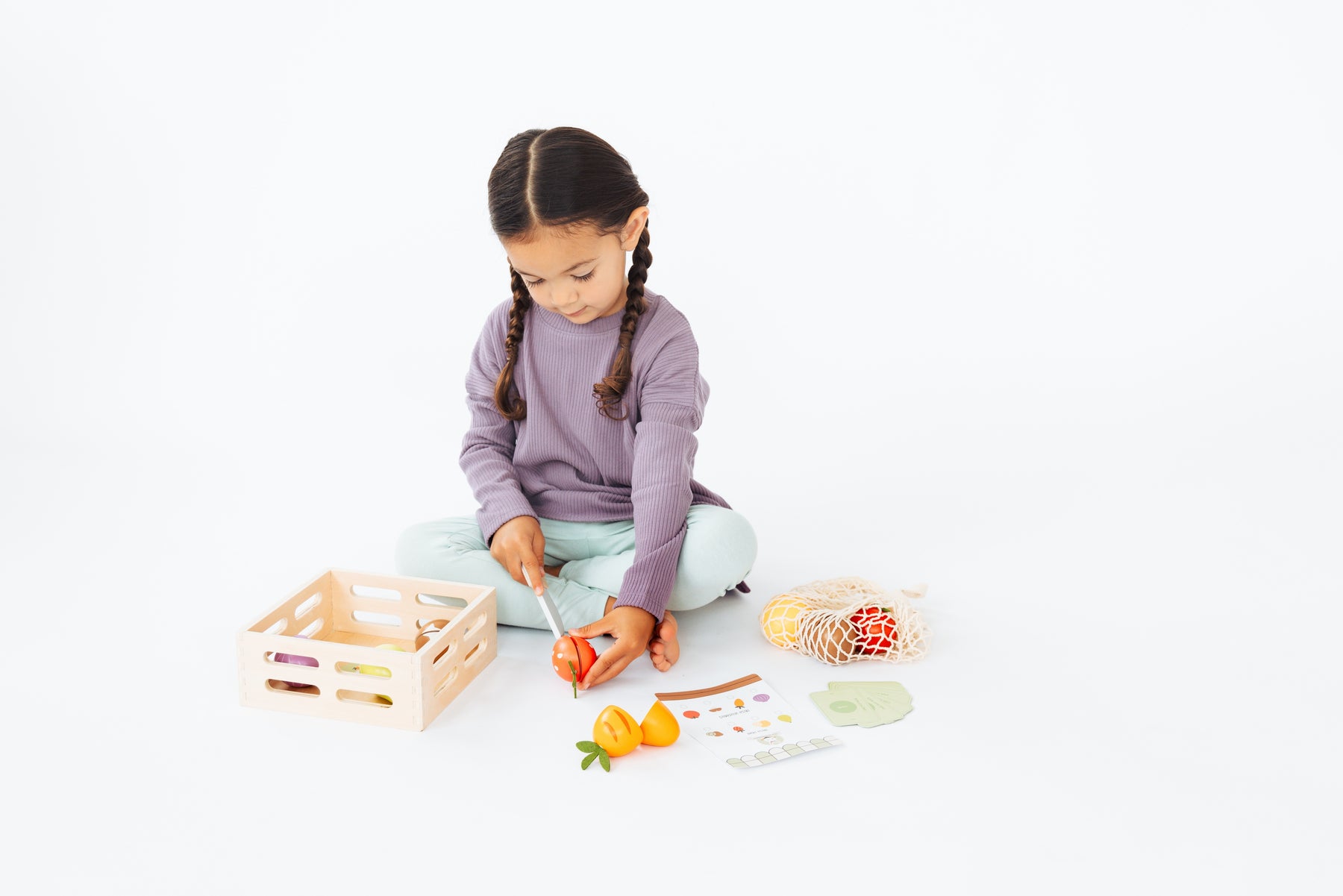 •     21-piece wooden farmers market set: Includes wooden market crate, fruits, vegetables, utensils, menu, play money, and a reusable shopping bag for endless pretend play. Teaches counting, sorting, and color recognition while encouraging imaginative storytelling.
