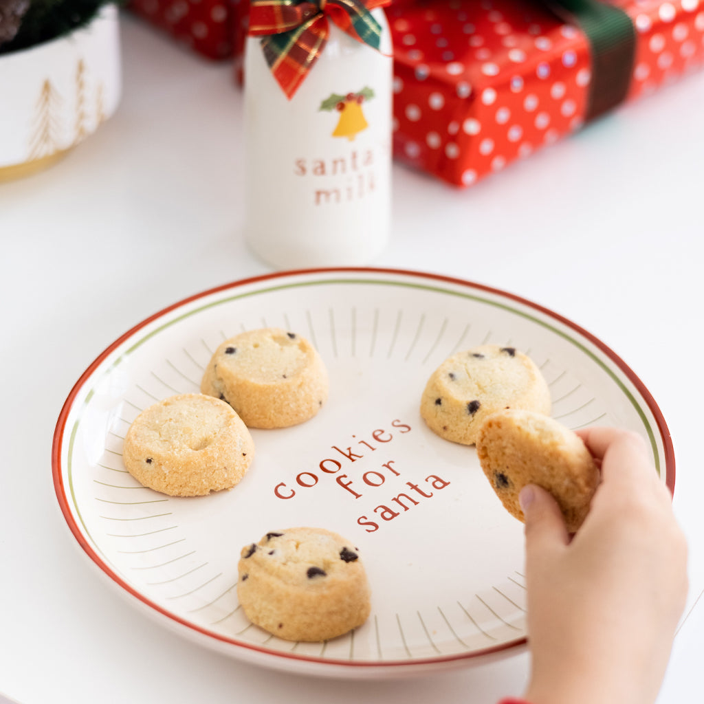 • Includes 1 red and white ceramic “cookies for Santa” plate and 1 ceramic “Santa’s milk” jug with a jingle bell design and plaid bow