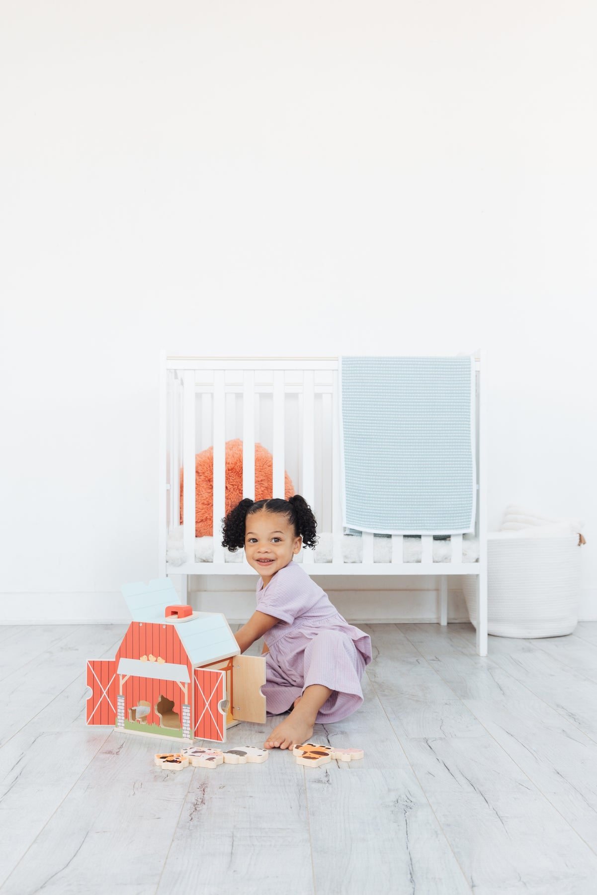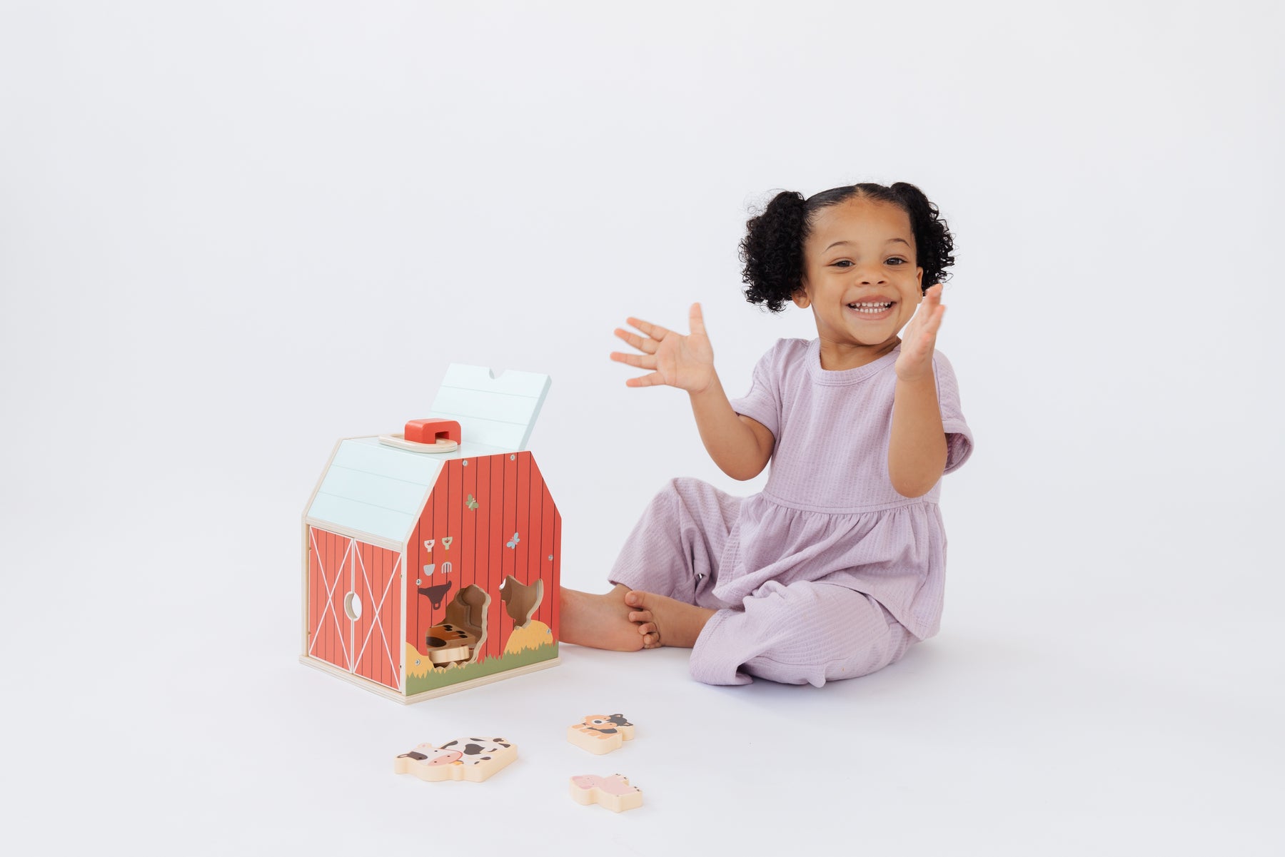 ·     6-piece Montessori farm shape & sorting toy: Includes six chunky wooden animals - cow, horse, pig, sheep, chicken, and dog - that fit into matching cutouts on a classic red barn. Perfect for early learning, this educational farm toy teaches shape recognition, animal names, and fine motor skills through hands-on play.