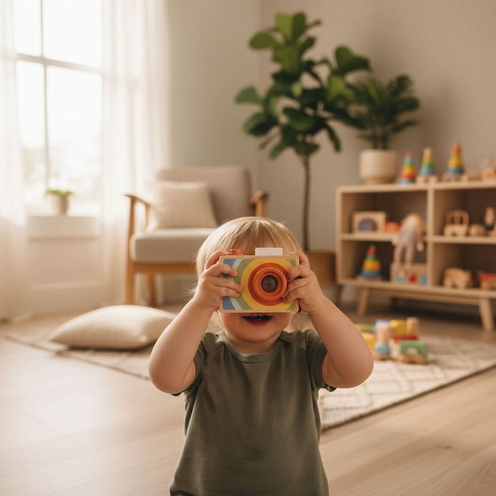 • Montessori pretend play camera: Inspire imagination and creativity with this realistic wooden toy camera featuring a movable click button and lens for hands-on, sensory play that encourages observation and storytelling.