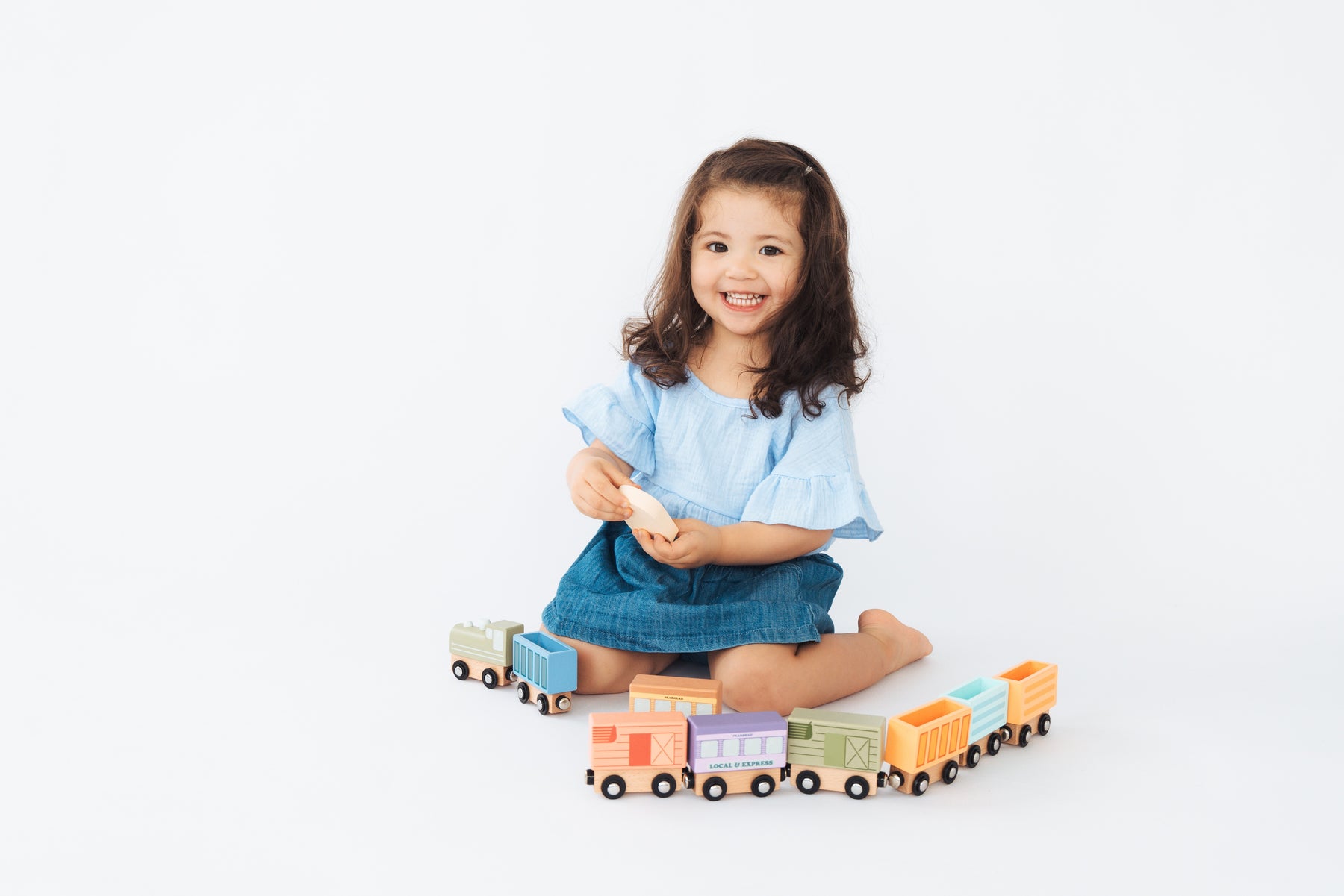 · Classic 9-piece wooden train set: Includes colorful cars and a friendly conductor figure for hours of imaginative play. Each car connects easily with child-safe magnetic links, encouraging creative building, sorting, and sequencing for toddlers.