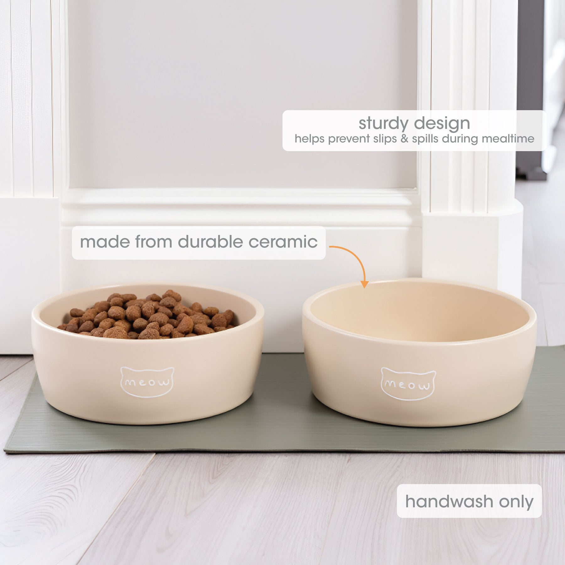 Neutral Taupe "Meow” Cat Design: Decorative ceramic cat bowl with “meow” script in a soft taupe finish, designed to match any kitchen or home décor while keeping your cat’s feeding area stylish and clean.