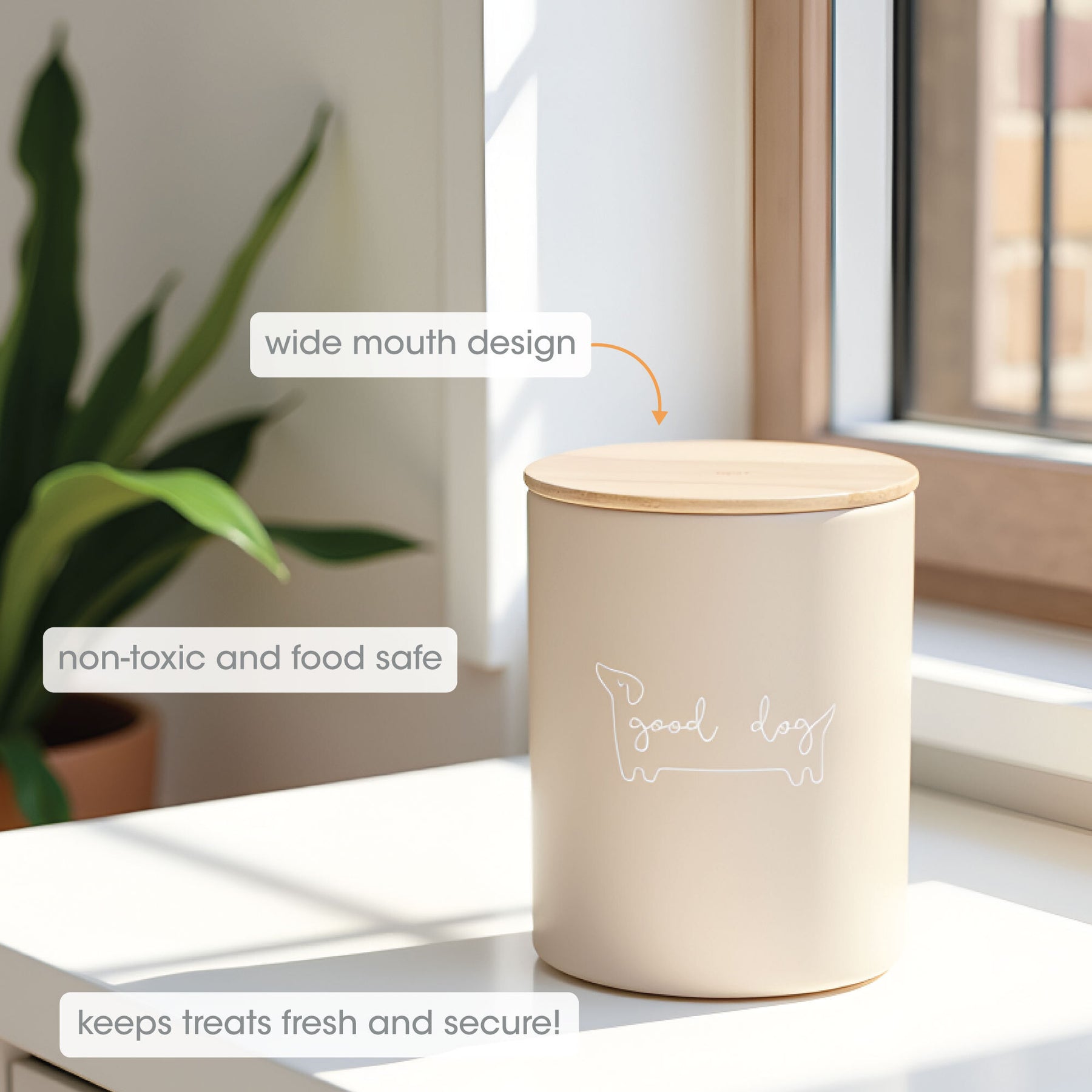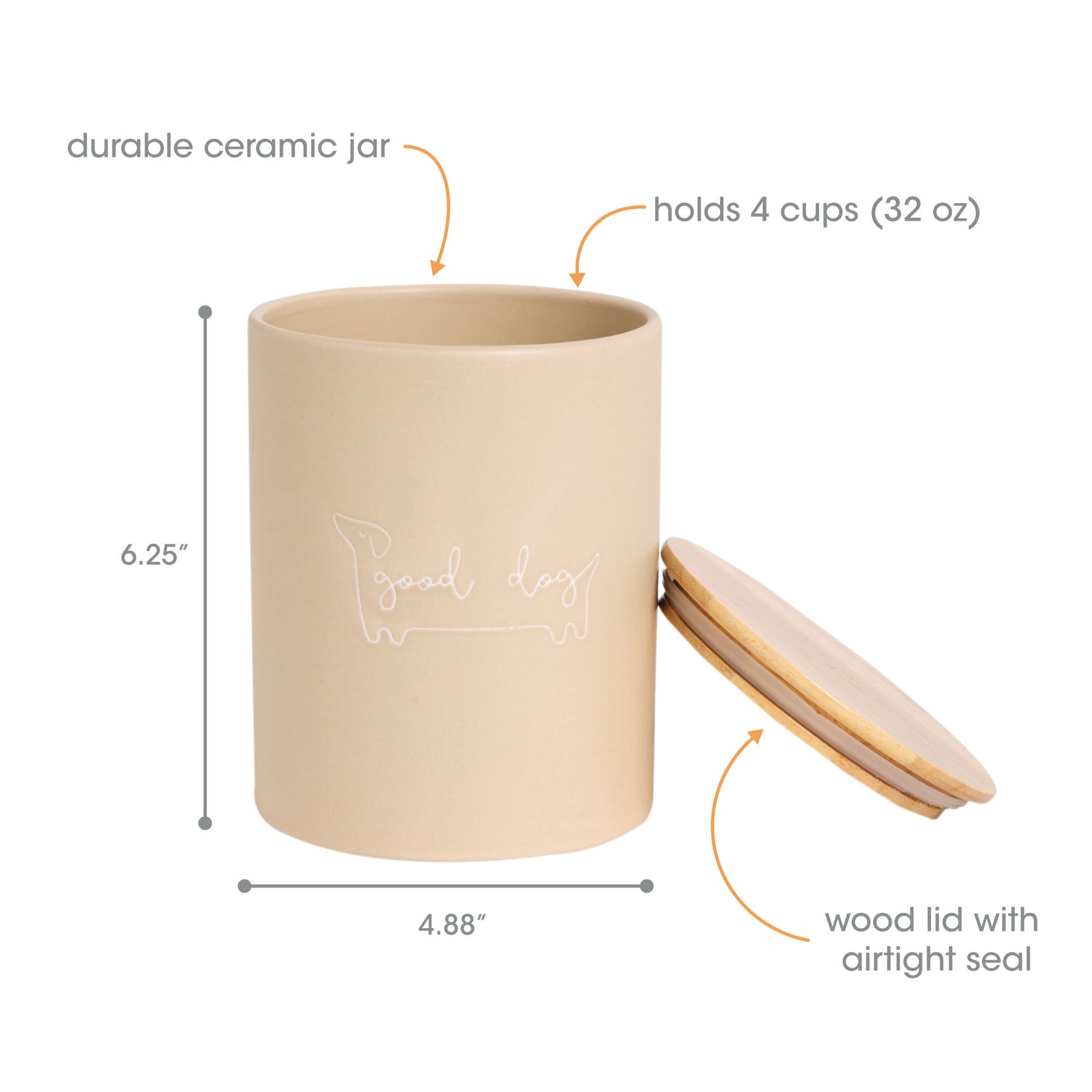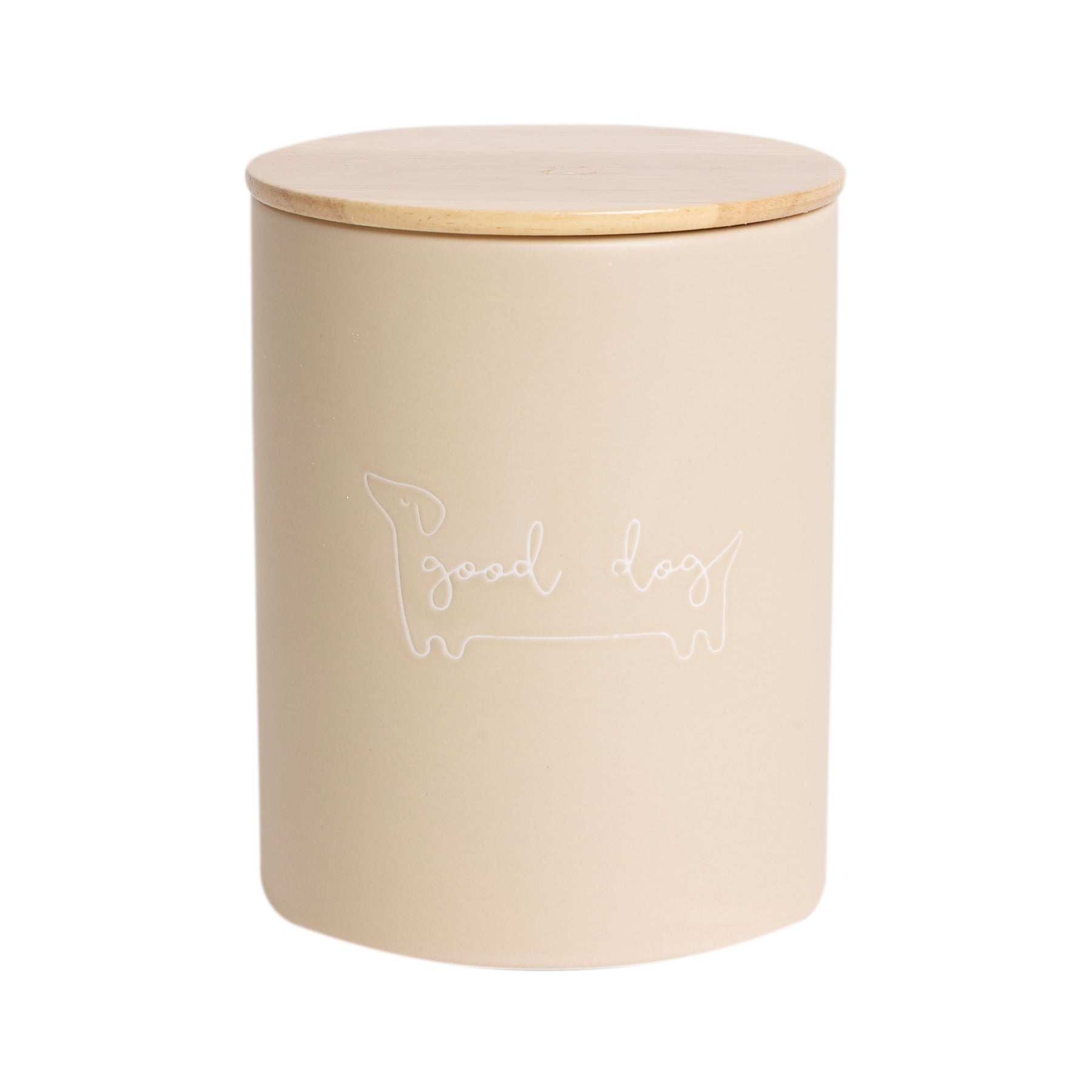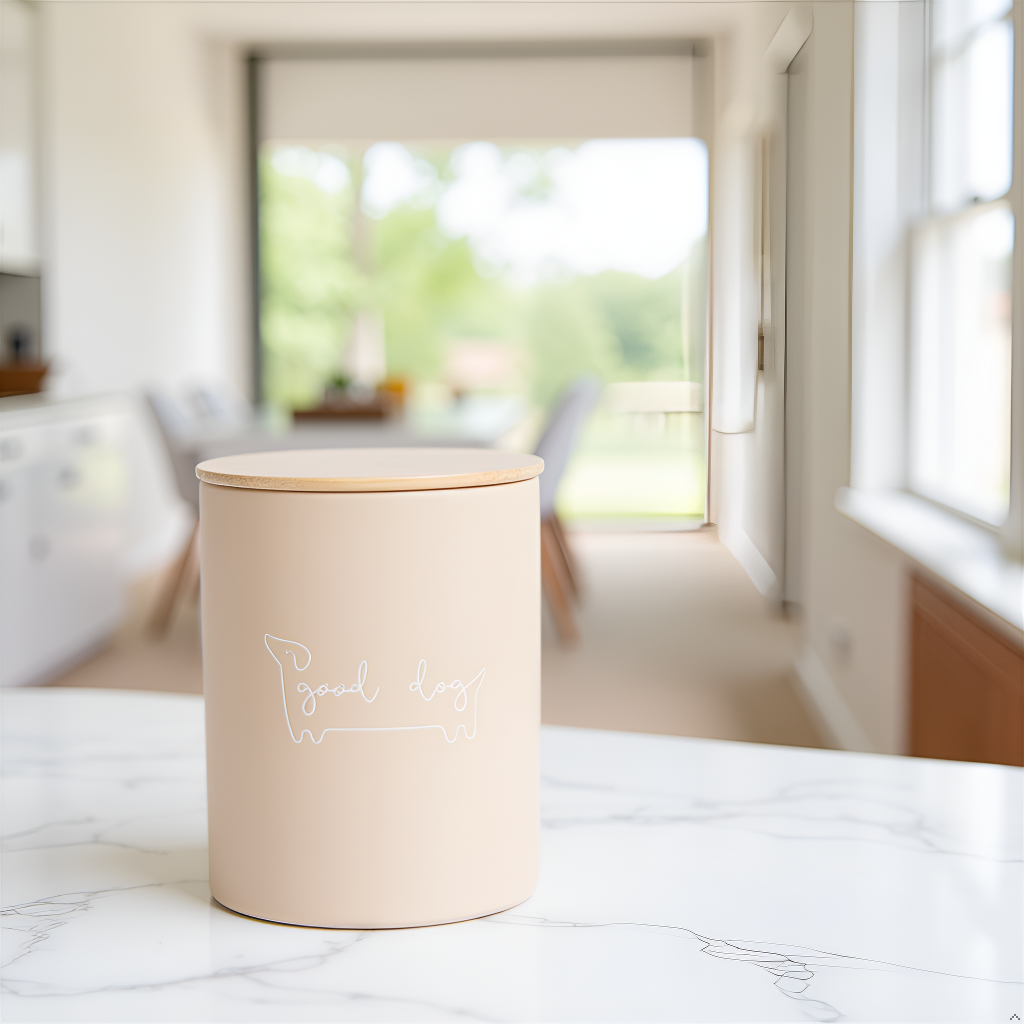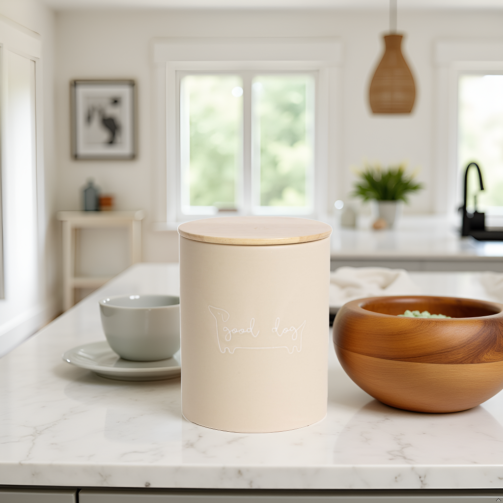 • Neutral Taupe “Good Dog” Design: Stylish ceramic treat jar in a soft taupe finish with “good dog” script, blending seamlessly with any kitchen or home décor while keeping your pet’s favorite snacks handy.
